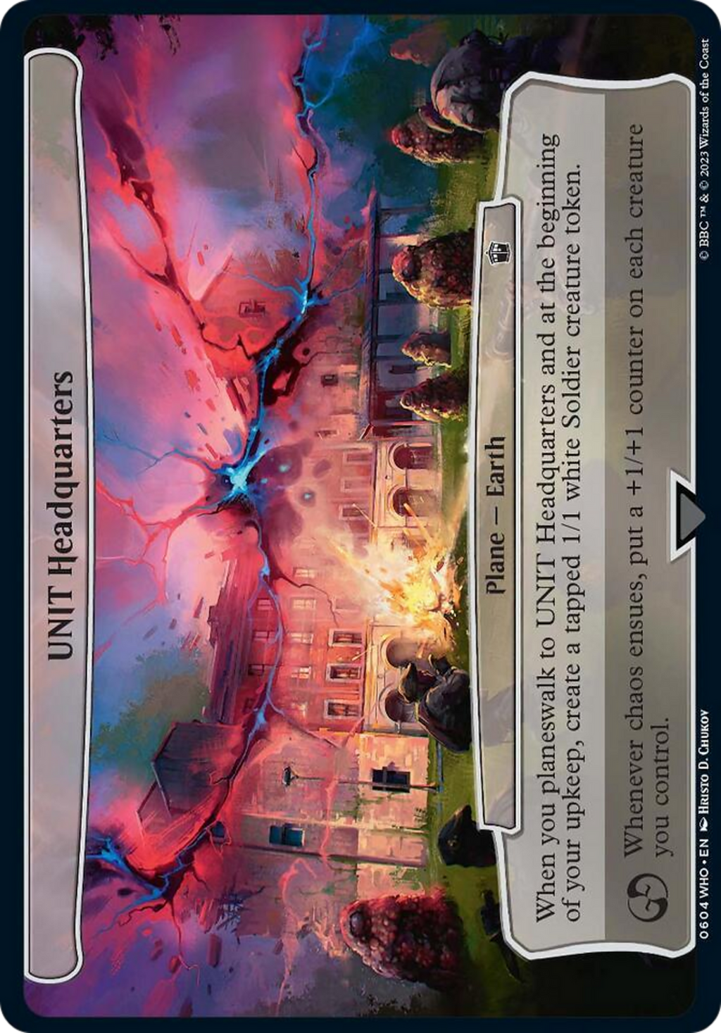 When you planeswalk to UNIT Headquarters and at the beginning of your upkeep, create a tapped 1/1 white Soldier creature token.