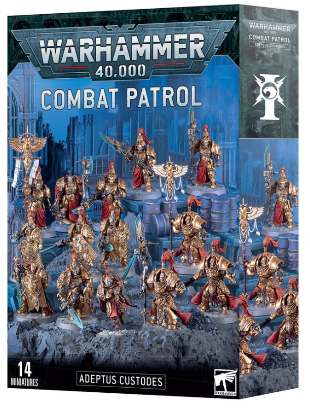 Combat Patrol: Adeptus Custodes gives you the means to persecute the enemies of the Throne with extreme prejudice in fast-paced games of Warhammer 40,000. It contains all the units you'll need to start a new army of gleaming golden warriors, or massively expand your existing collection with essential units. It also saves you money over buying each kit individually. This balanced force includes a leader, a stalwart unit of Custodian Guard, a veteran unit of Custodian Wardens, and an extra elite unit of Terminator Armour-clad Allarus Custodians, giving you a full force for Combat Patrol games – the rules are available as a free download on the Warhammer Community website.