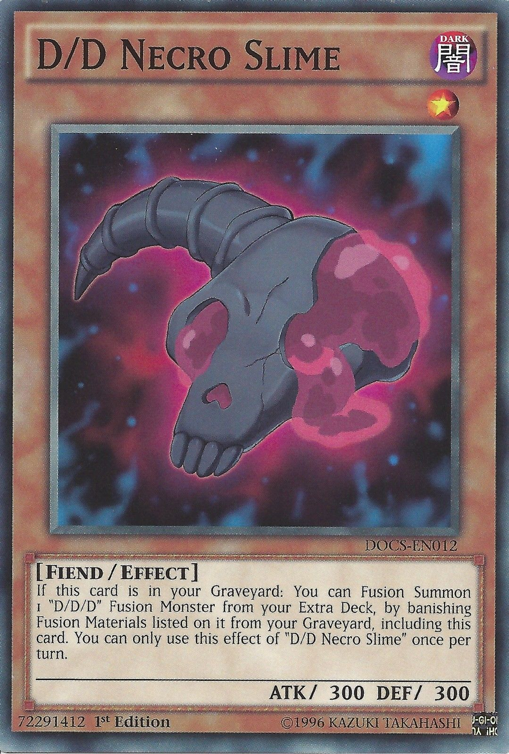 If this card is in your Graveyard: You can Fusion Summon 1 "D/D/D" Fusion Monster from your Extra Deck, by banishing Fusion Materials listed on it from your Graveyard, including this card. You can only use this effect of "D/D Necro Slime" once per turn.