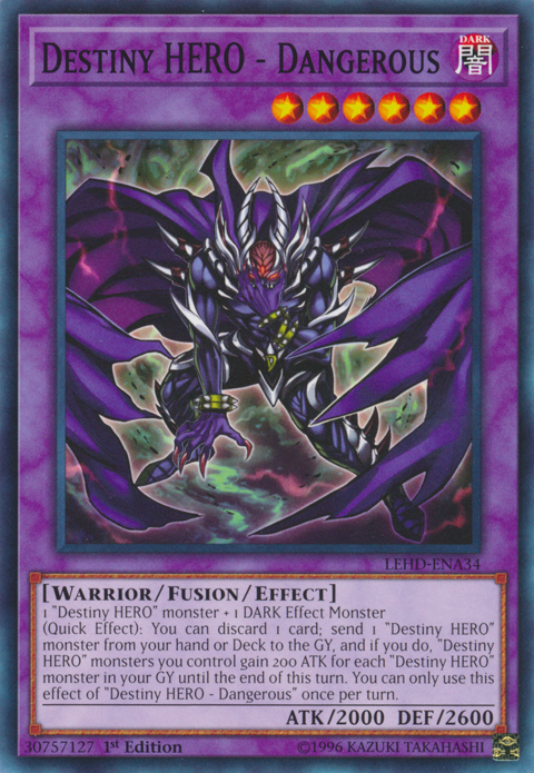 1 "Destiny HERO" monster + 1 DARK Effect Monster (Quick Effect): You can discard 1 card; send 1 "Destiny HERO" monster from your hand or Deck to the GY, and if you do, "Destiny HERO" monsters you control gain 200 ATK for each "Destiny HERO" monster in your GY until the end of this turn. You can only use this effect of "Destiny HERO - Dangerous" once per turn.