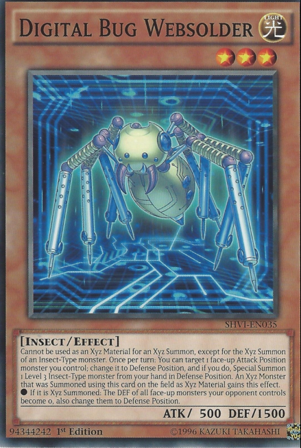 Cannot be used as an Xyz Material for an Xyz Summon, except for the Xyz Summon of an Insect-Type Xyz Monster. Once per turn: You can target 1 face-up Attack Position monster you control; change it to Defense Position, and if you do, Special Summon 1 Level 3 Insect-Type monster from your hand in Defense Position. An Xyz Monster that was Summoned using this card on the field as Xyz Material gains this effect. •If it is Xyz Summoned: The DEF of all monsters your opponent currently controls become 0, also change those monsters to Defense Position.