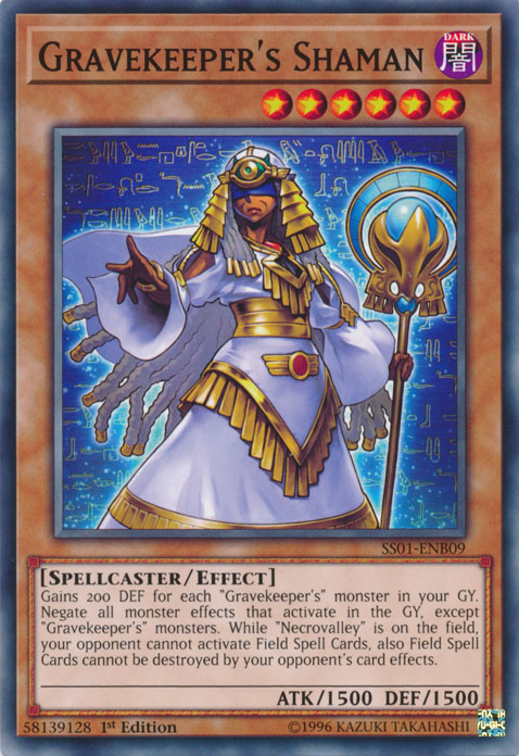 Gains 200 DEF for each "Gravekeeper's" monster in your GY. Negate all monster effects that activate in the GY, except "Gravekeeper's" monsters. While "Necrovalley" is on the field, your opponent cannot activate Field Spell Cards, also Field Spell Cards on the field cannot be destroyed by your opponent's card effects.