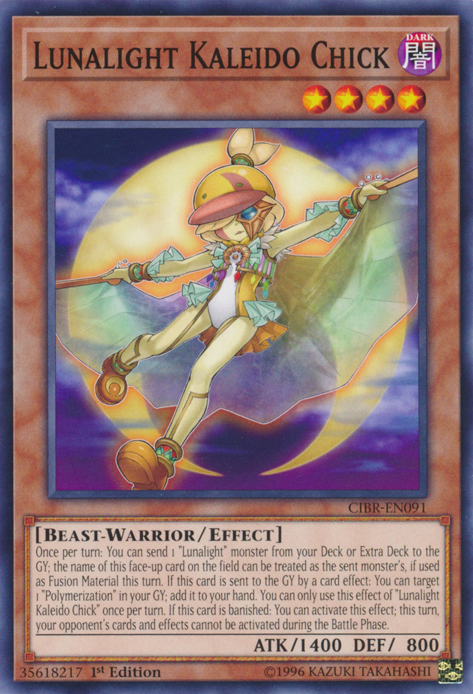 Once per turn: You can send 1 "Lunalight" monster from your Deck or Extra Deck to the GY; the name of this face-up card on the field can be treated as the sent monster's, if used as Fusion Material this turn. If this card is sent to the GY by a card effect: You can target 1 "Polymerization" in your GY; add it to your hand. You can only use this effect of "Lunalight Kaleido Chick" once per turn. If this card is banished: You can activate this effect; this turn, your opponent's cards and effects cannot be activated during the Battle Phase.