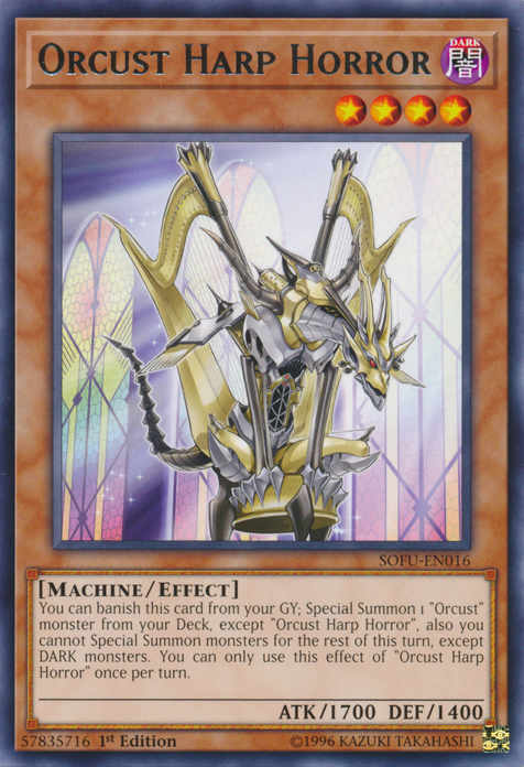 You can banish this card from your GY; Special Summon 1 “Orcust” monster from your Deck, except “Orcust Harp Horror”, also you cannot Special Summon monsters for the rest of this turn, except DARK monsters. You can only use this effect of “Orcust Harp Horror” once per turn.