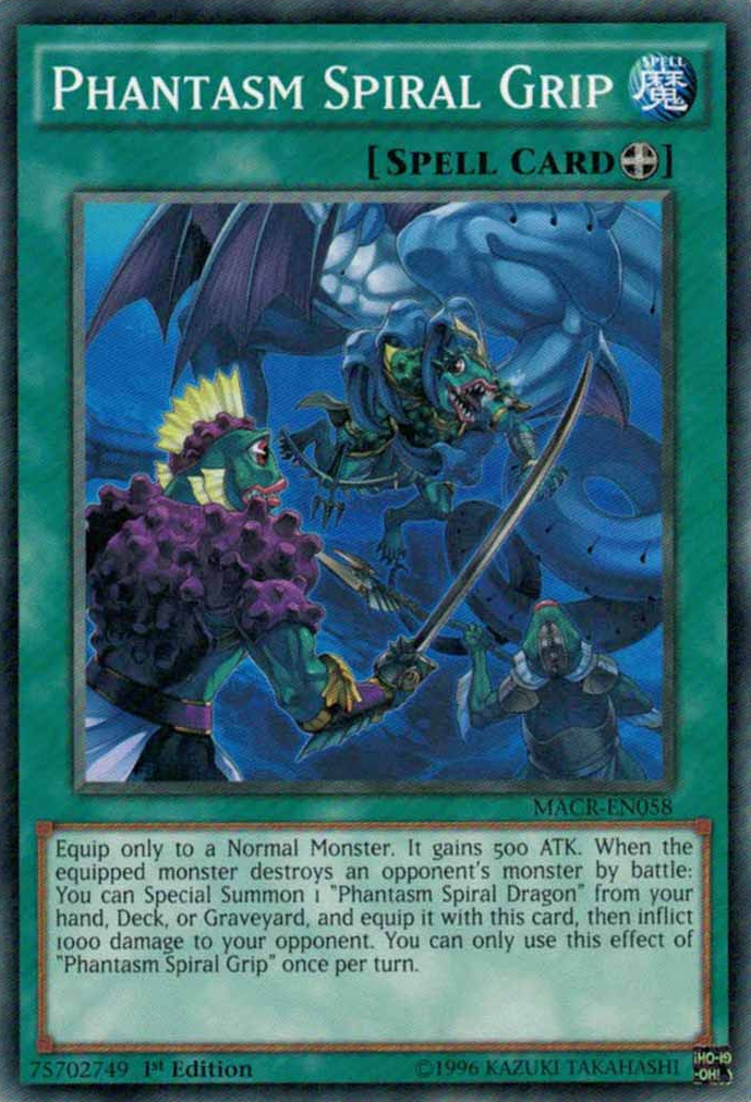 Equip only to a Normal Monster. It gains 500 ATK. When the equipped monster destroys an opponent's monster by battle: You can Special Summon 1 "Phantasm Spiral Dragon" from your hand, Deck, or Graveyard, and equip it with this card, then inflict 1000 damage to your opponent. You can only use this effect of "Phantasm Spiral Grip" once per turn.