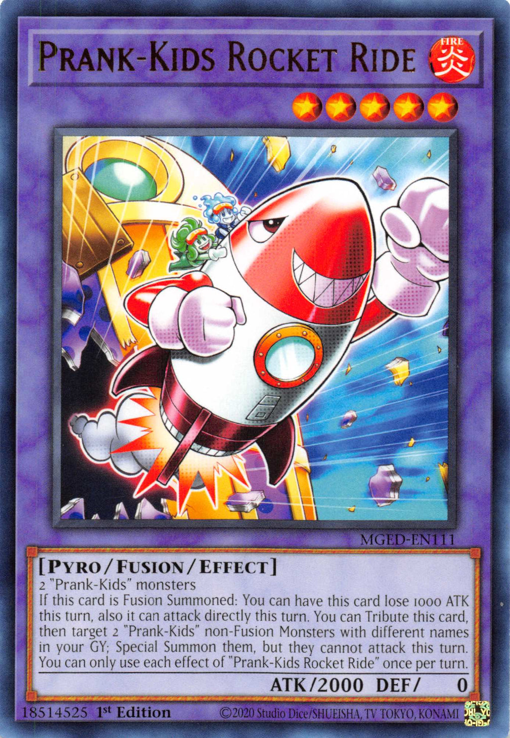 2 "Prank-Kids" monsters If this card is Fusion Summoned: You can have this card lose 1000 ATK this turn, also it can attack directly this turn. You can Tribute this card, then target 2 "Prank-Kids" non-Fusion Monsters with different names in your GY; Special Summon them, but they cannot attack this turn. You can only use each effect of "Prank-Kids Rocket Ride" once per turn.