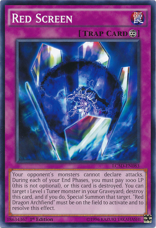 Your opponent's monsters cannot declare attacks. During each of your End Phases, you must pay 1000 LP (this is not optional), or this card is destroyed. You can target 1 Level 1 Tuner monster in your Graveyard; destroy this card, and if you do, Special Summon that target. "Red Dragon Archfiend" must be on the field to activate and to resolve this effect.