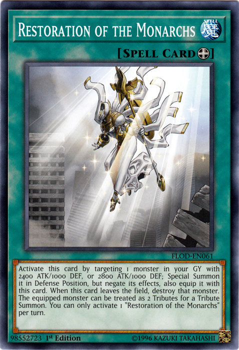 Activate this card by targeting 1 monster in your GY with 2400 ATK/1000 DEF, or 2800 ATK/1000 DEF; Special Summon it in Defense Position, but negate its effects, also equip it with this card. When this card leaves the field, destroy that monster. The equipped monster can be treated as 2 Tributes for a Tribute Summon. You can only activate 1 "Restoration of the Monarchs" per turn.