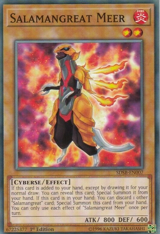 If this card is added to your hand, except by drawing it for your normal draw: You can reveal this card; Special Summon it from your hand. If this card is in your hand: You can discard 1 other "Salamangreat" card; Special Summon this card from your hand. You can only use each effect of "Salamangreat Meer" once per turn.