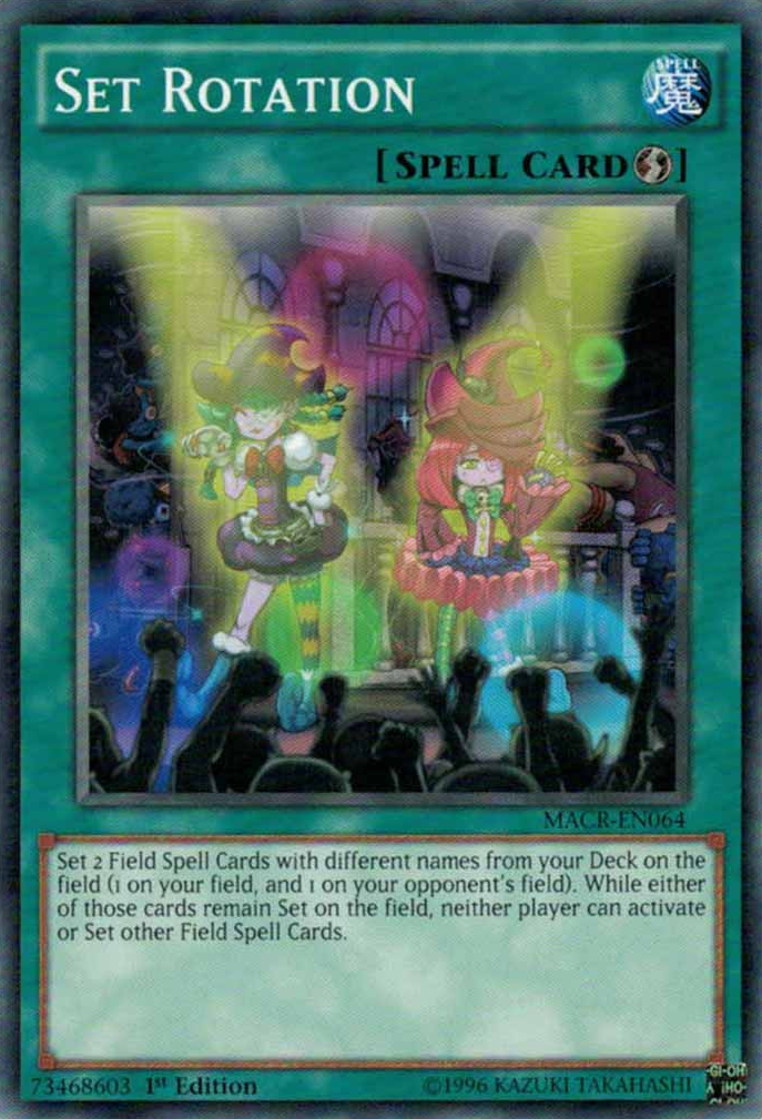 Set 2 Field Spell Cards with different names from your Deck on the field (1 on your field, and 1 on your opponent's field). While either of those cards remain Set on the field, neither player can activate or Set other Field Spell Cards.