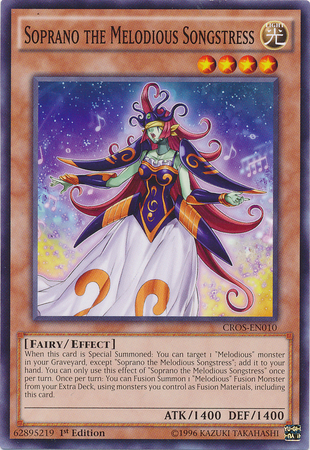 When this card is Special Summoned: You can target 1 "Melodious" monster in your Graveyard, except "Soprano the Melodious Songstress"; add it to your hand. You can only use this effect of "Soprano the Melodious Songstress" once per turn. Once per turn: You can Fusion Summon 1 "Melodious" Fusion Monster from your Extra Deck, using monsters you control as Fusion Materials, including this card.