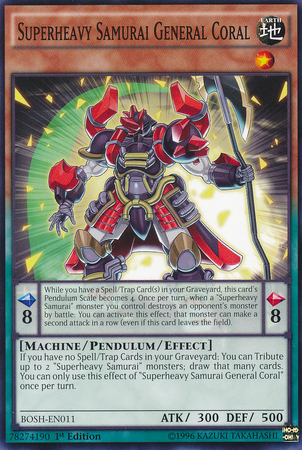 If you have no Spell/Trap Cards in your Graveyard: You can Tribute up to 2 "Superheavy Samurai" monsters; draw that many cards. You can only use this effect of "Superheavy Samurai General Coral" once per turn.