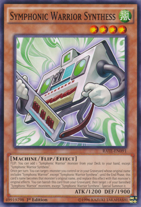 You can add 1 "Symphonic Warrior" monster from your Deck to your hand, except "Symphonic Warrior Synthess". Once per turn: You can target 1 monster you control or in your Graveyard whose original name includes "Symphonic Warrior", except "Symphonic Warrior Synthess"; until the End Phase, this card's name becomes that monster's original name, and replace this effect with that monster's original effects. You can banish this card from your Graveyard, then target 1 of your banished "Symphonic Warrior" monsters, except "Symphonic Warrior Synthess"; Special Summon it.