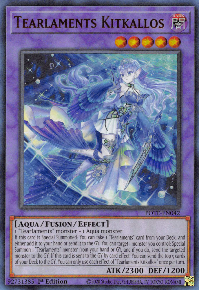 1 "Tearlaments" monster + 1 Aqua monster If this card is Special Summoned: You can take 1 "Tearlaments" card from your Deck, and either add it to your hand or send it to the GY. You can target 1 monster you control; Special Summon 1 "Tearlaments" monster from your hand or GY, and if you do, send the targeted monster to the GY. If this card is sent to the GY by card effect: You can send the top 5 cards of your Deck to the GY. You can only use each effect of "Tearlaments Kitkallos" once per turn.