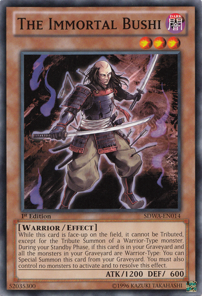 While this card is face-up on the field, it cannot be Tributed, except for the Tribute Summon of a Warrior-Type monster. During your Standby Phase, if this card is in your Graveyard and all the monsters in your Graveyard are Warrior-Type: You can Special Summon this card from your Graveyard. You must also control no monsters to activate and to resolve this effect.