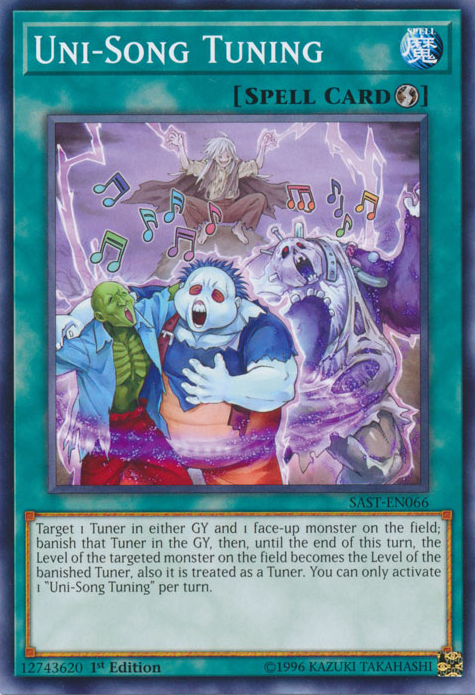 Target 1 Tuner in either GY and 1 face-up monster on the field; banish that Tuner in the GY, then, until the end of this turn, the Level of the targeted monster on the field becomes the Level of the banished Tuner, also it is treated as a Tuner. You can only activate 1 "Uni-Song Tuning" per turn.