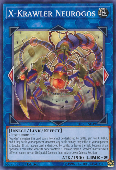 2 Insect monsters "Krawler" monsters this card points to cannot be destroyed by battle, gain 300 ATK/DEF, and if they battle your opponent's monster, any battle damage they inflict to your opponent is doubled. If this face-up card is destroyed by battle, or leaves the field because of an opponent's card effect while its owner controls it: You can target 2 "Krawler" monsters with different names in your GY; Special Summon them in face-down Defense Position.